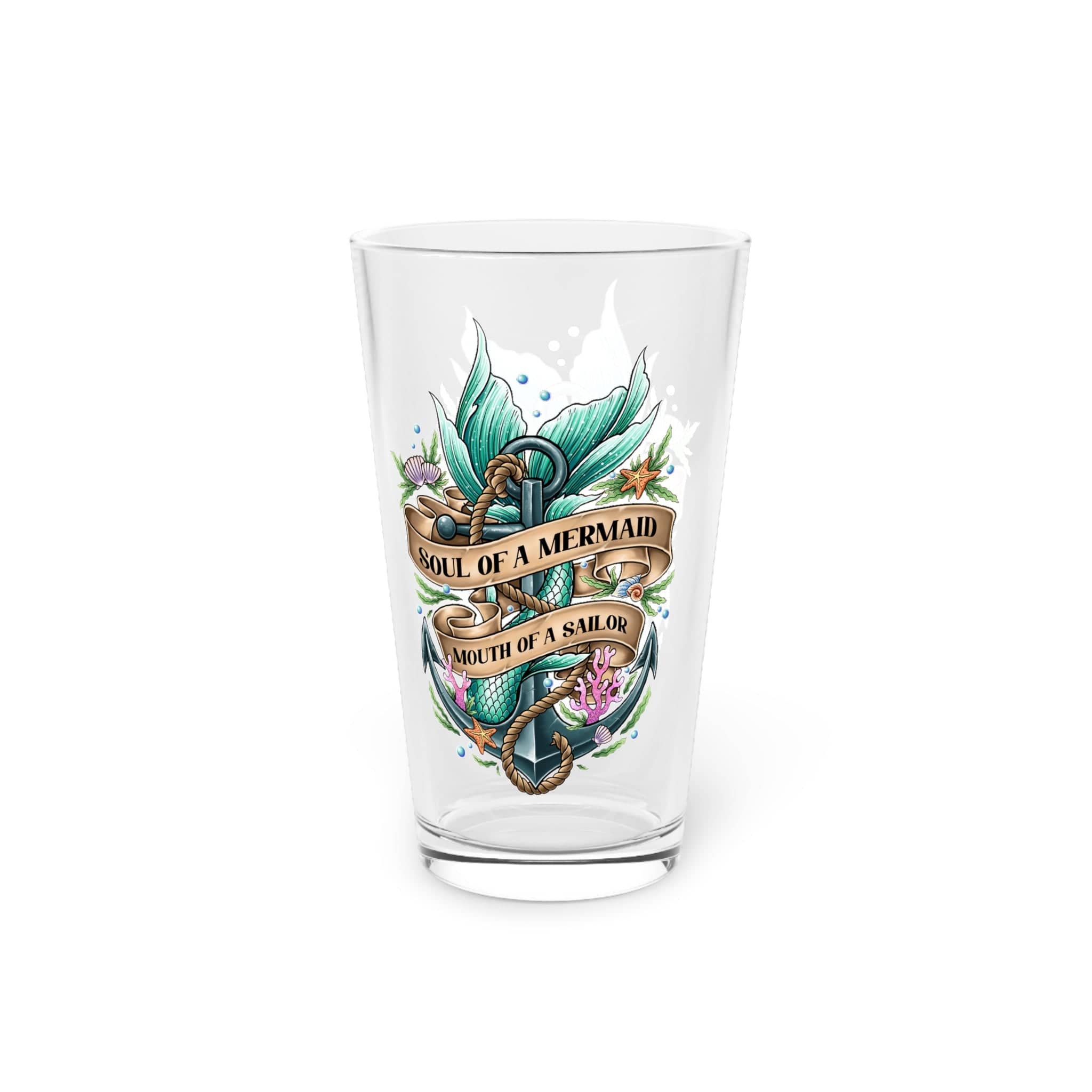 Meet the pint glass with more personality than a dockside tavern at high tide. Featuring your hand-drawn Soul of a Mermaid, Mouth of a Sailor design, this glass celebrates those who navigate life with equal parts magic and mischief. The artwork wraps the glass in sea-green tails, coral blooms, and a weathered anchor, all tied together with that infamous banner that lets everyone know exactly what kind of trouble you bring to the table.