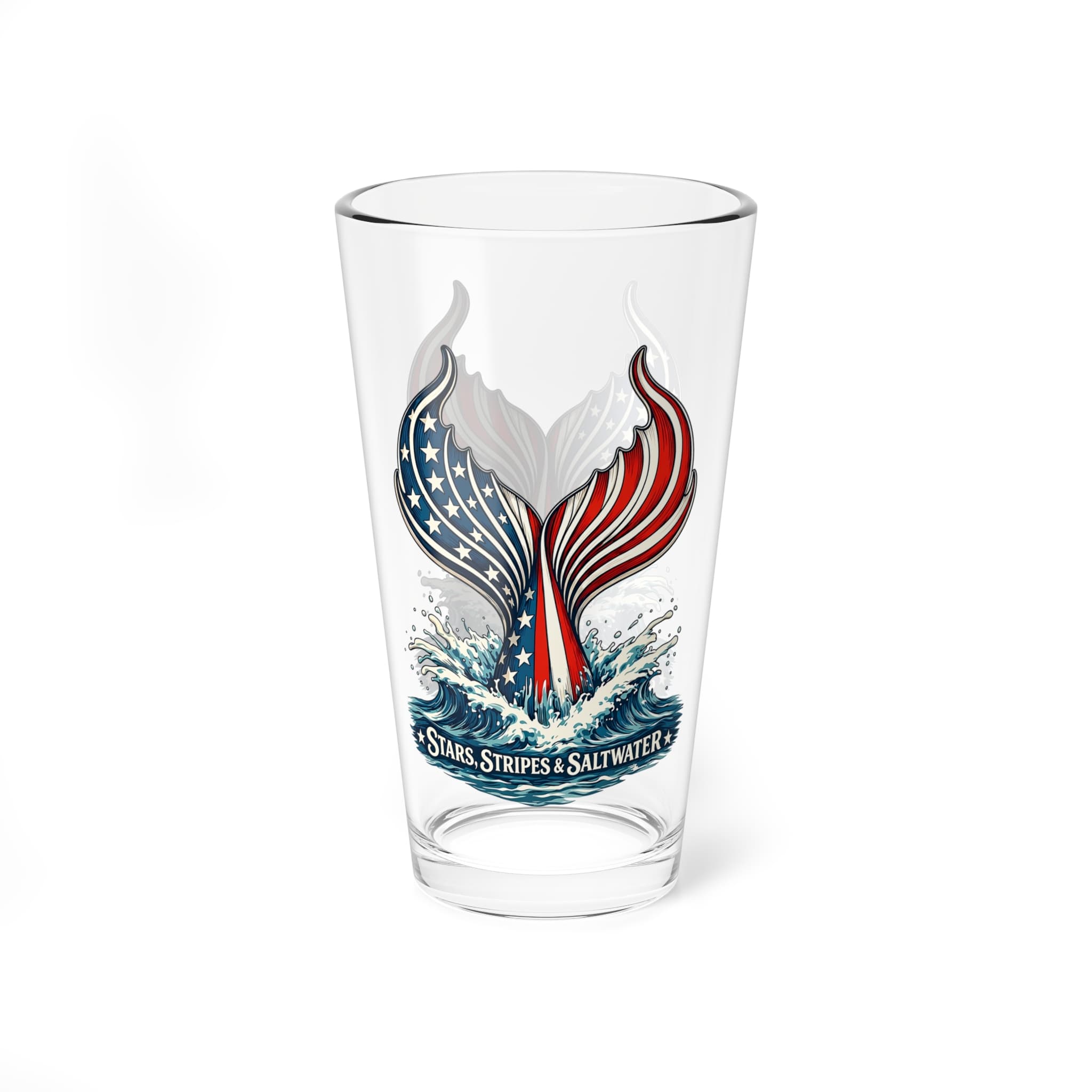 This 16oz pint glass brings seaside spirit to your home bar. Clear, heavy-bottomed glass holds cocktails, shakes, or everyday drinks while showcasing a bold patriotic Mermaid tail design with stars, stripes, and splashing waves. It feels sturdy in the hand, resists chips during regular use, and cleans easily in the dishwasher. Use it as a shaker for stirred cocktails, a casual tumbler for iced coffee, or a decorative piece on a coastal-themed shelf. The artwork adds a lively, nautical touch great for evenings on the deck, summer cookouts, or those who collect maritime-inspired barware.