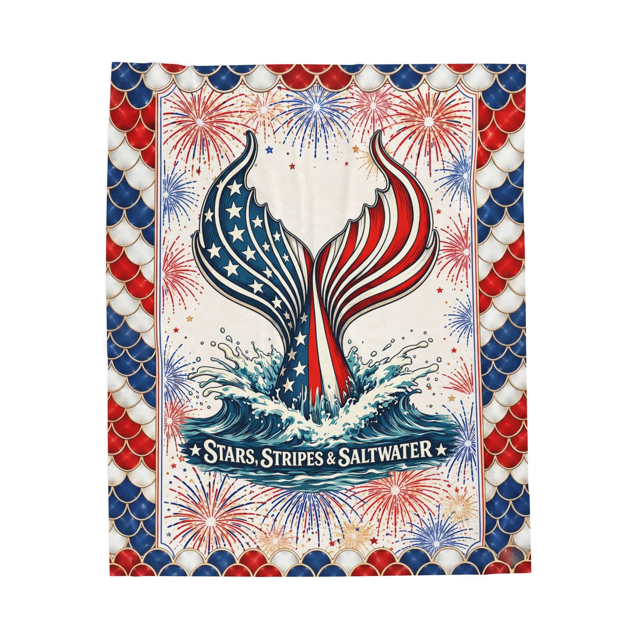 Wrap yourself in a wave of summer nights and backyard firework glow. This plush velveteen blanket features a bold nautical-patriotic illustration, with a mermaid tail painted in stars and stripes rising through foamy surf, framed by a scalloped red, white, and blue border and bursts of fireworks overhead.
