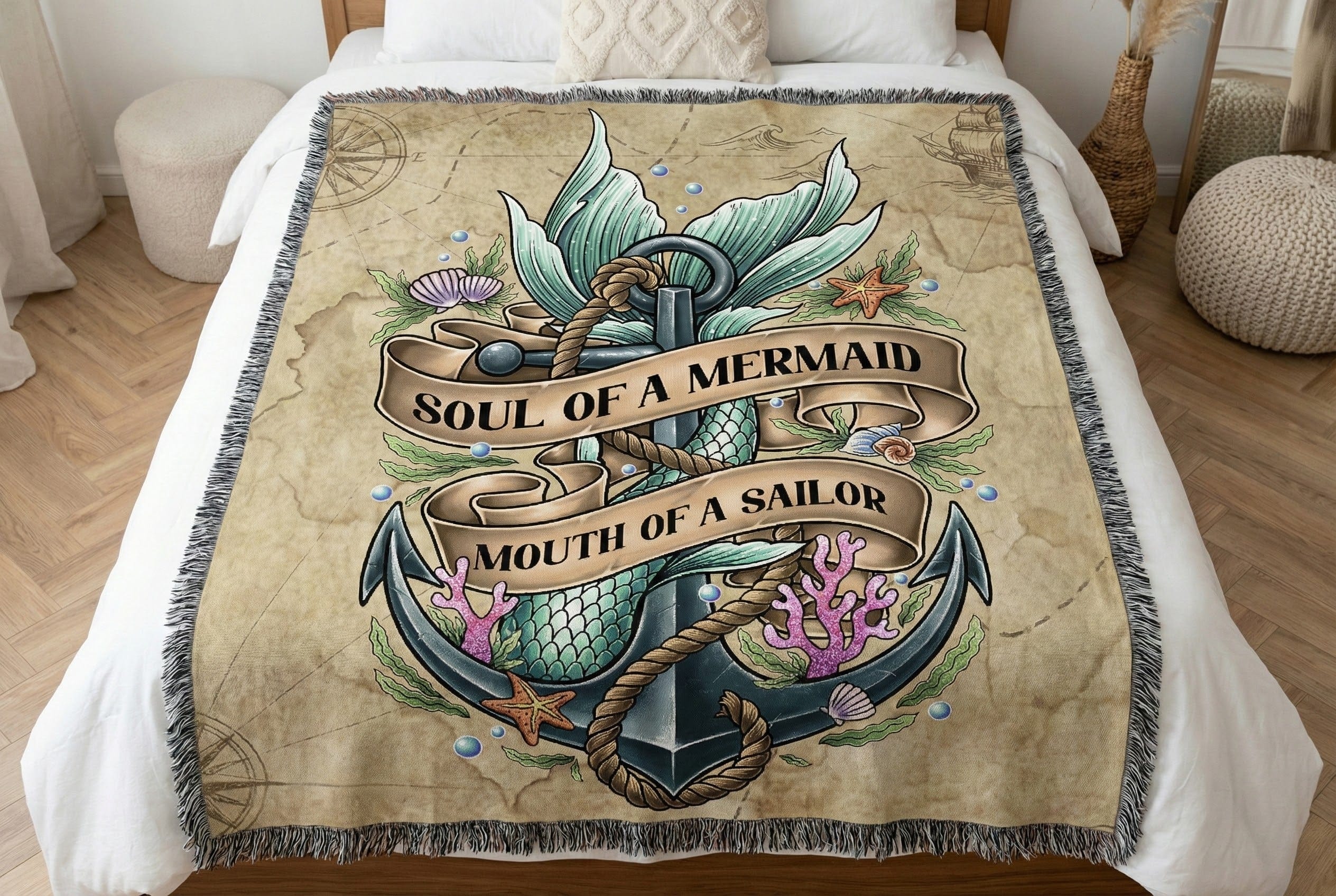 Wrap yourself in a little bit of magic and a whole lot of sass. Our "Soul of a Mermaid, Mouth of a Sailor" woven blanket is the ultimate cozy companion for the sea-lover who isn't afraid to speak their mind.