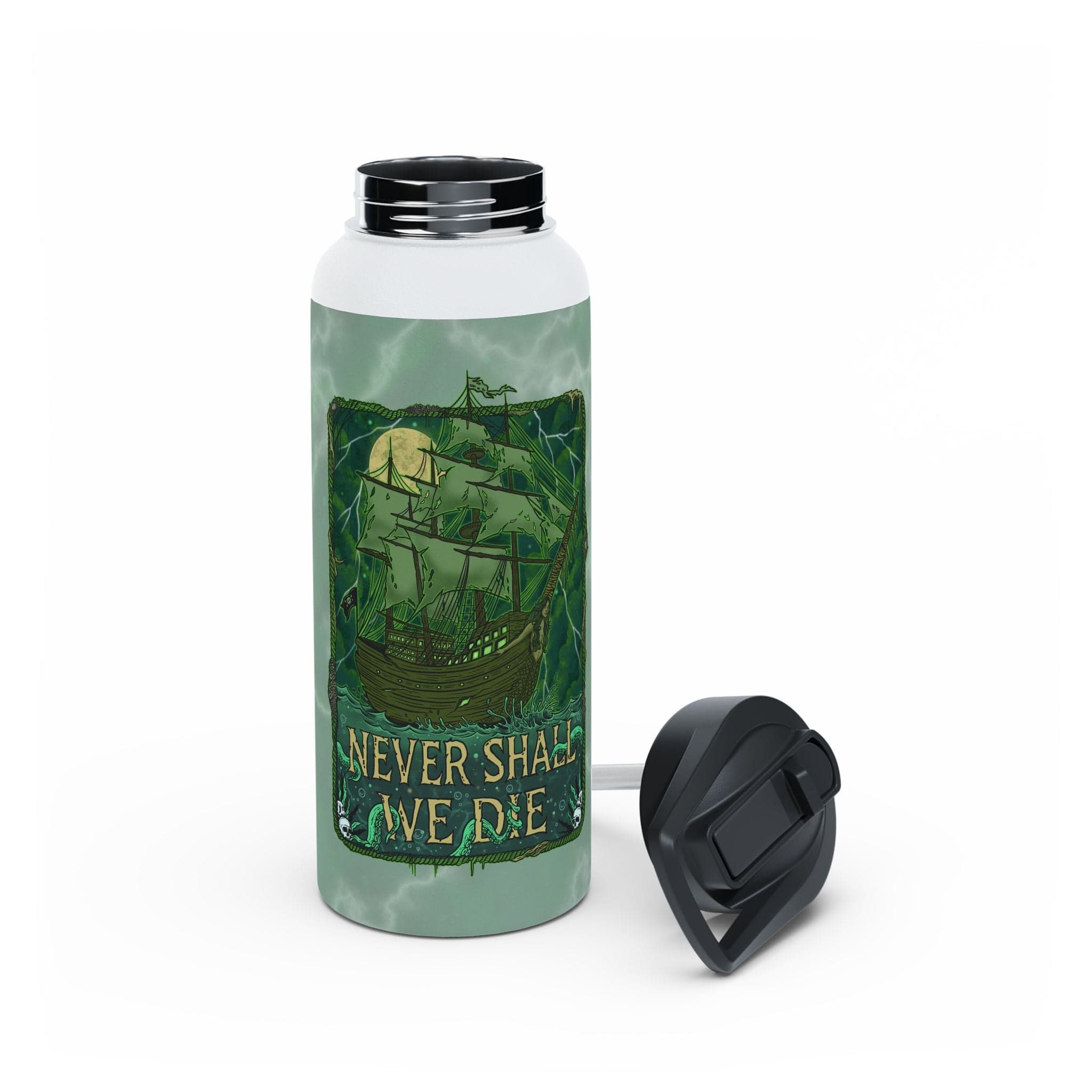 Stay hydrated with this epic Flying Dutchman 32oz Water Bottle. The design is wrapped in an atmospheric green lightning storm, setting the scene for the stunningly detailed ghost ship. The legendary vessel is featured prominently, with the defiant motto "NEVER SHALL WE DIE" printed below.